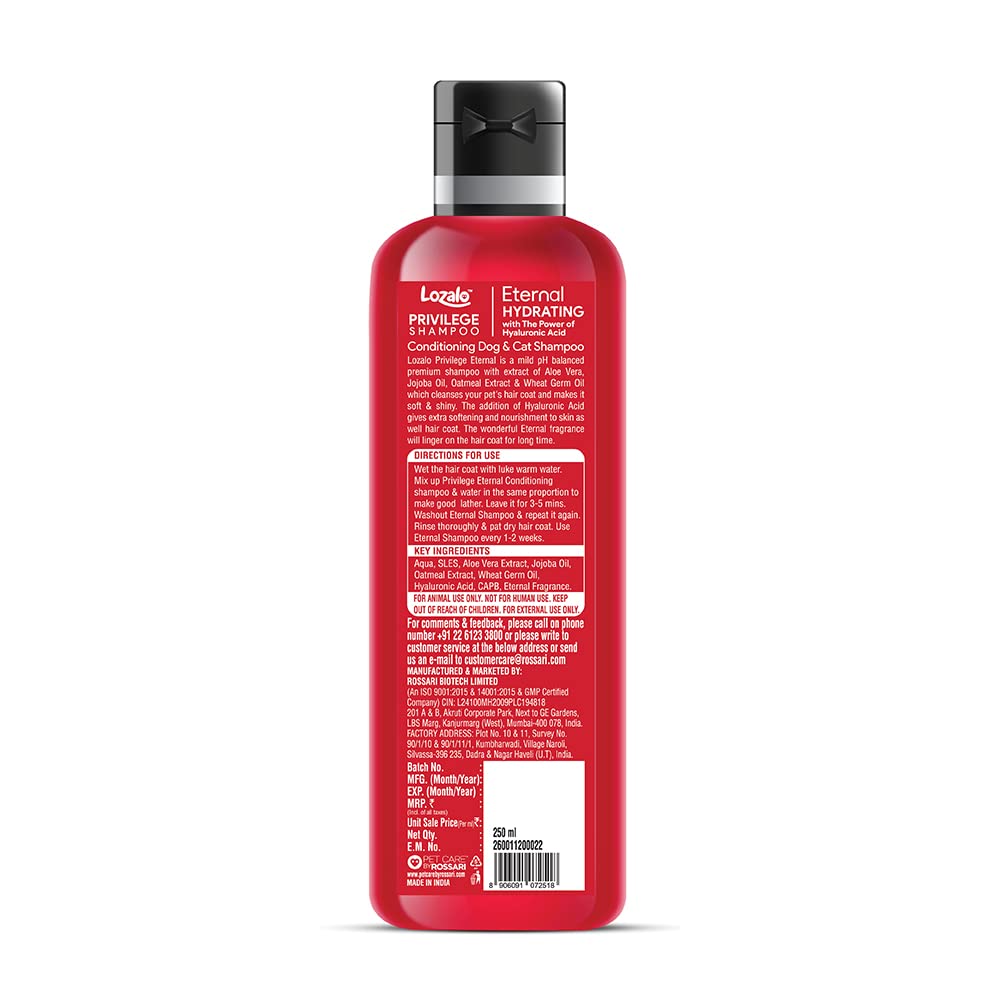 Lozalo Privilege Shampoo is a gentle, premium-care formula designed to keep your pet?s coat clean, soft, and healthy. Enriched with soothing ingredients and balanced pH, it helps reduce dryness, removes dirt and odour, and leaves the fur shiny with a long-lasting fresh fragrance. Suitable for regular use on both dogs and cats, it nourishes the skin while maintaining natural oils ? perfect for pets with sensitive coats.
