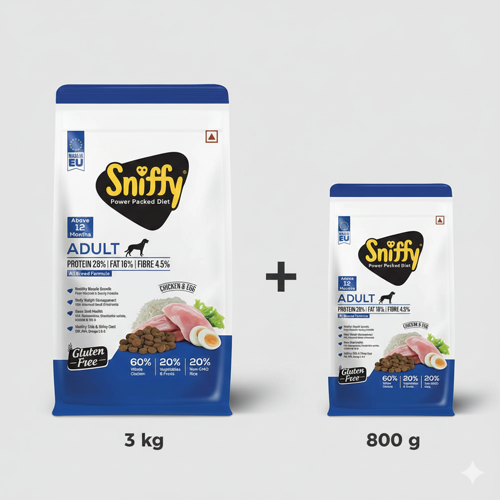 Sniffy Adult Combo (3kg + 800gm) provides complete nutrition to support strength, energy, and overall health in adult dogs.