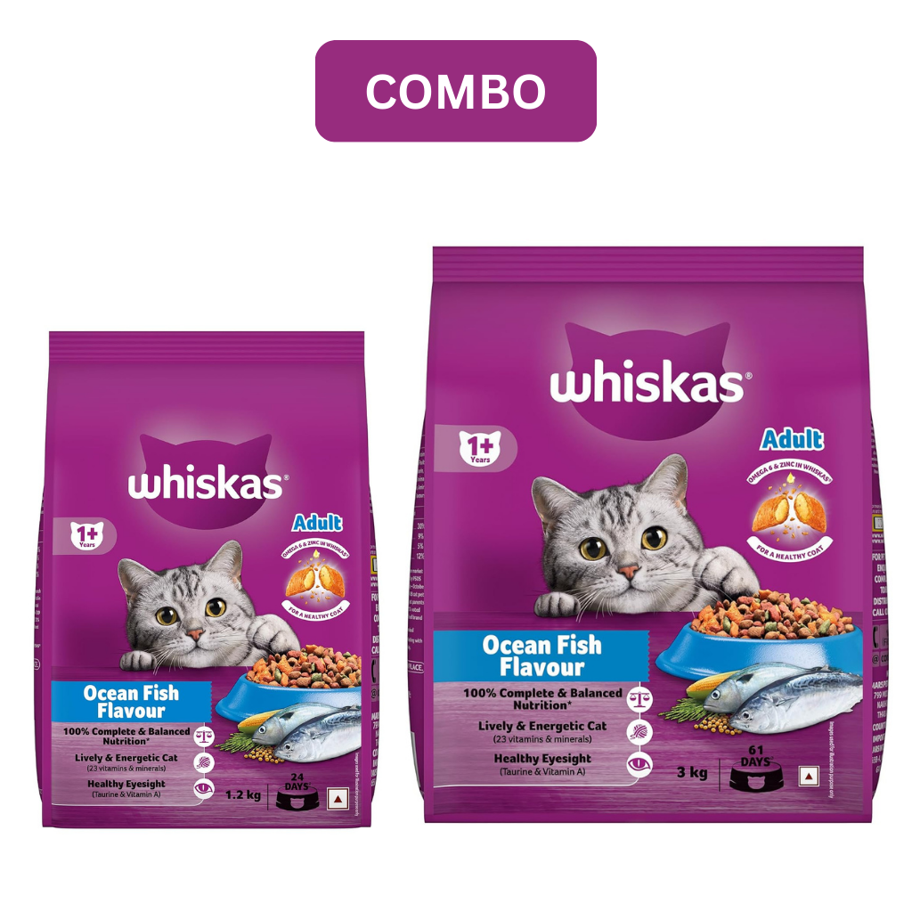 Whiskas Adult Dry Cat Food | Ocean Fish Combo | 1.2 kg + 3 kg